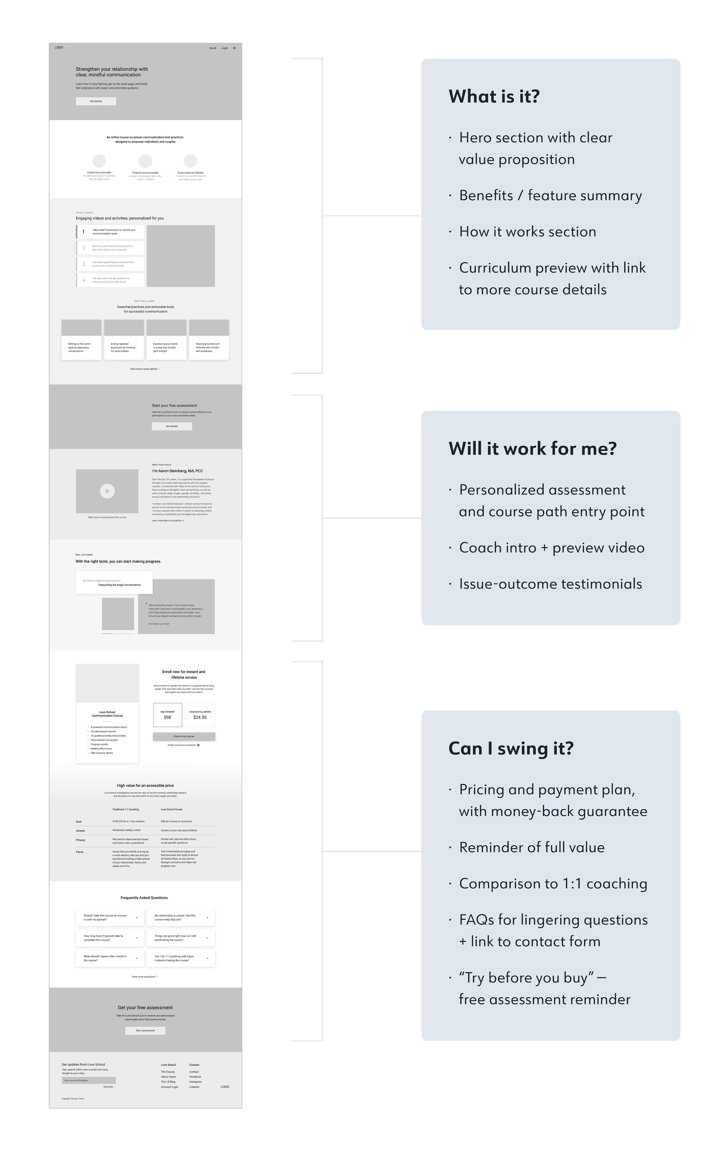 After several drafts of copy and changes to the wireframes, I was concerned that the content was starting to feel overwhelming instead of compelling, and that we were moving farther away from what we’d learned from the research.