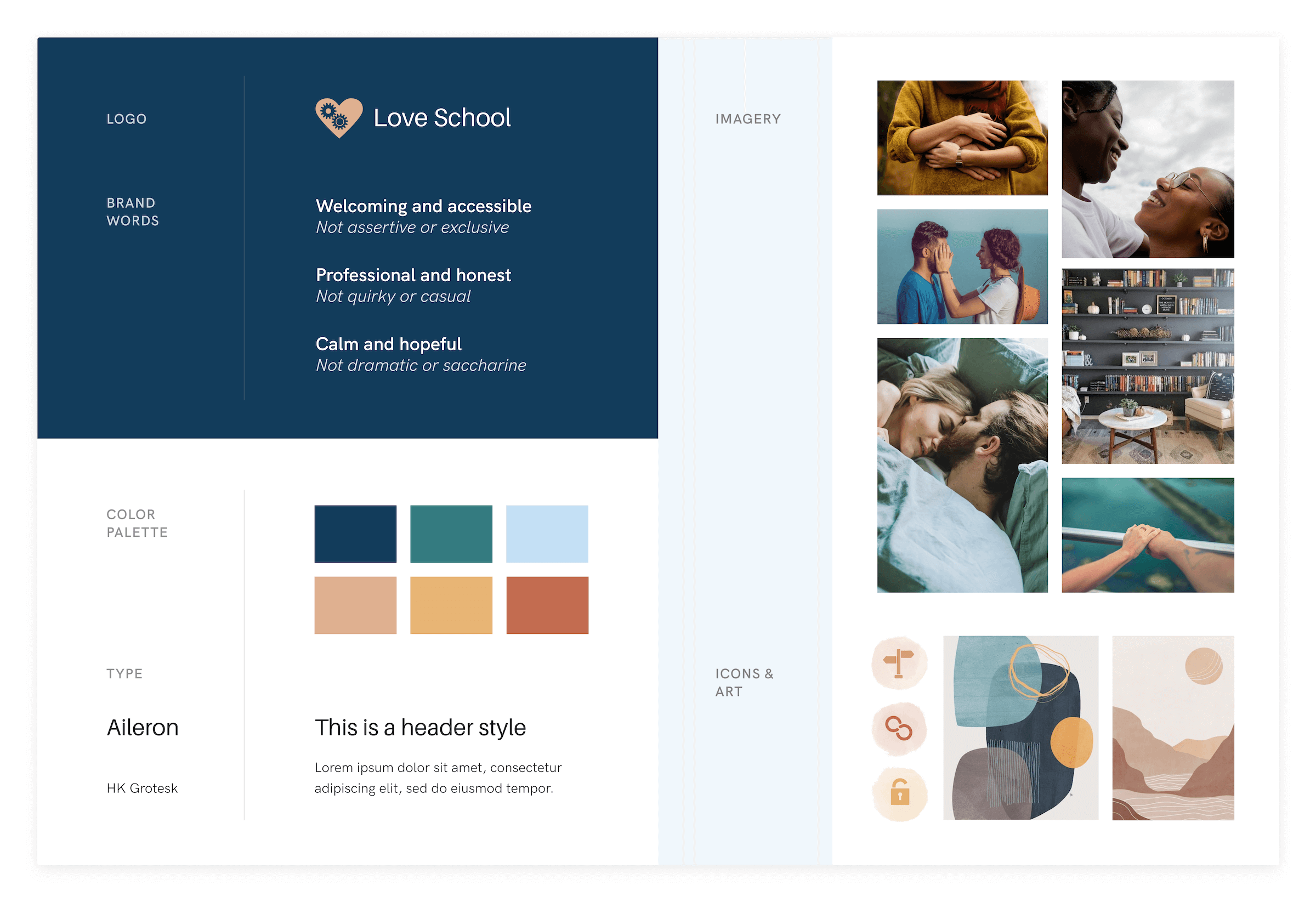 With accessible pricing, a peaceful color palette, welcoming imagery and a genuine tone, Love School meets people where they are, taking their concerns seriously while giving them hope.